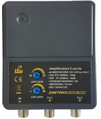 Amplificatore di linea, 1 ingresso, 2 uscite. Regolazione separata del guadagno in banda VHF e UHF fino a 20dB (guadagno massimo 25dB).Filtro LTE integrato, autoalimentato.MIGLIORA/POTENZIA IL SEGNALE
