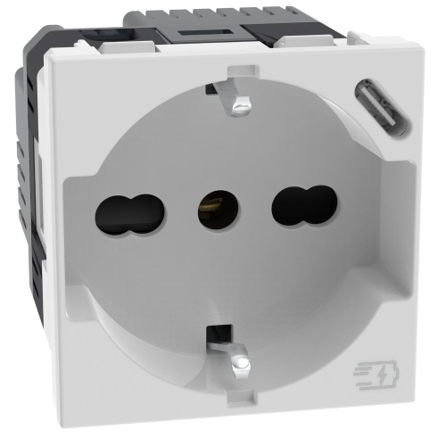 Presa standard Italia P40 con caricatore USB integrato. Presa 2 P+T 16 A 250 Va.c. - interasse 19 mm e 26 mm in configurazione bipasso - alveoli protetti; contatti laterali di terra per spine standard tedesco. Adatta per: spine standard Italia 2 P e 2 P+T 10/16 A; spine standard tedesco 2 P+T 16 A. Presa USB tipo C Power Delivery max 18W per ricarica di dispositivi elettronici fino a 1500 mA - 2 moduli - bianco