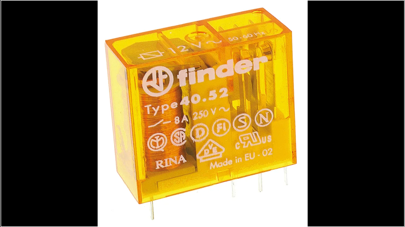 Relè di potenza Finder serie 40 Series, DPDT, 2 Contatti bobina 12V ca, Montaggio su circuito stampato